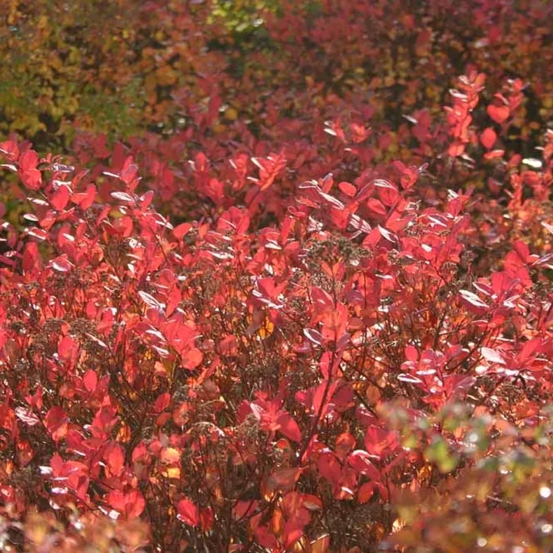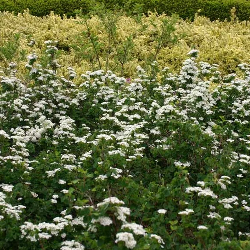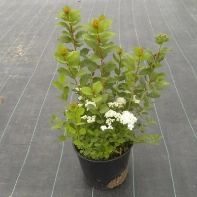 Birkebladet spiræa. Kompakt tæt busk. Ca 0,6 m høj, 1 m bred. Hvide blomster i små skærme i juni, rigtblomstrende. Rød-gule høstfarver. Placeres i sol – halvskygge. – Salgshøjde: 30-50 cm. – Pottestr. 3.5 liter